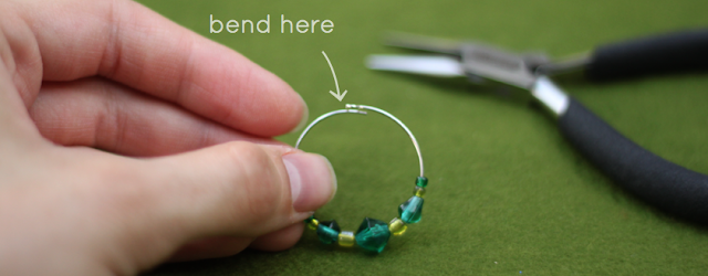 These hoops are made from memory wire and they end with a small circle on one end. You can get them in a variety of sizes in the wire section of most jewelry supply stores. I have a large piece of felt that I make all of my jewelry on. It keeps the beads from jumping away from me, and folds up nicely. I suggest picking a color that is darker and pleasing to the eye, because you probably don't want to be squinting at florescent pink for too long.